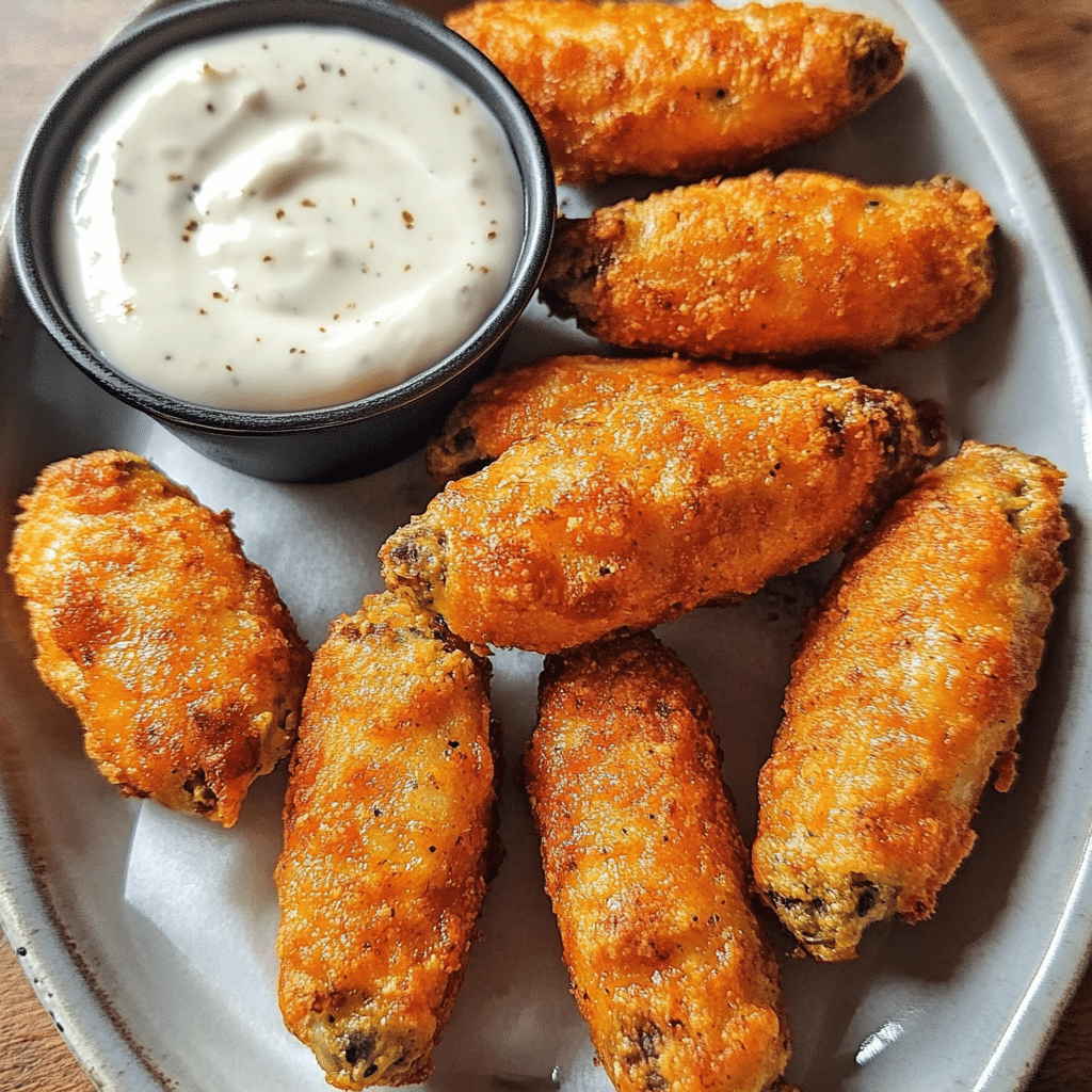 Buffalo Wing Poppers are a fun, bite-sized twist on the classic buffalo wings, perfect for parties or casual gatherings. These poppers feature tender pieces of chicken or a plant-based alternative, coated in a spicy, tangy buffalo sauce and then stuffed inside a crispy, breadcrumb-coated exterior. Think of them as mini “stuffed” wings—each popper has a creamy filling, such as a blend of cheese, ranch, or blue cheese dressing, which melts beautifully inside when baked or fried. The spicy buffalo sauce adds a bold kick, while the cheesy filling provides a satisfying, creamy balance. Served with a side of cool ranch or blue cheese dipping sauce, these poppers are the perfect finger food for anyone who loves bold, zesty flavors in a bite-sized form!