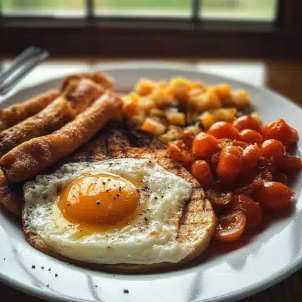 - Plate the Breakfast: On each plate, arrange the cooked sausages, eggs, grilled tomatoes, sautéed mushrooms, and a portion of baked beans. Add two slices of toast on the side.