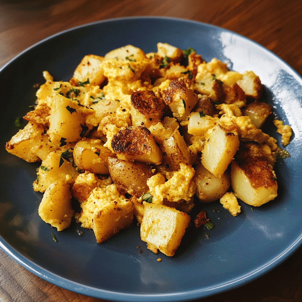 Scrambled Spuds & Eggs is a comforting and hearty breakfast dish that combines crispy, golden-brown potatoes with fluffy scrambled eggs. The potatoes are usually diced and cooked until tender and crispy, often seasoned with onions, peppers, and herbs for extra flavor. Then, the scrambled eggs are added to the pan, creating a perfect blend of crispy and creamy textures. This dish is versatile and can be customized with your favorite ingredients like cheese, bacon, or salsa. It’s a filling, flavorful meal that’s great for breakfast or brunch!